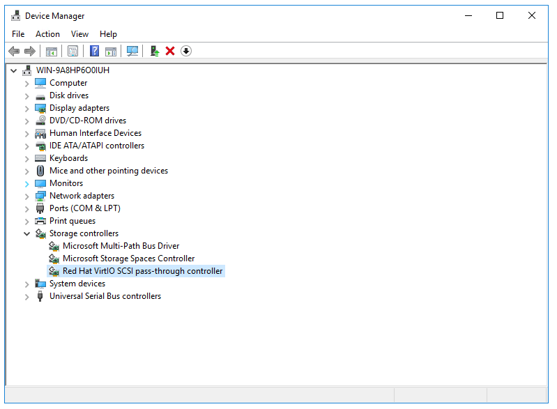 Откройте диспетчер устройств и убедитесь в том, что у вас присутствует и нормально работает устройство Red Hat VirtIO SCSI pass-through controller.