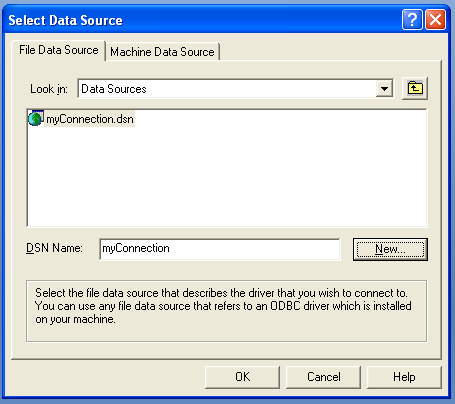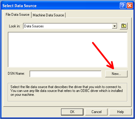 4. Далее вам будет показан диалог выбора источника данных. Этот диалог не является частью программ Microsoft Office, но частью Windows. Нажмите кнопку "New" - создать новый источник данных ODBC.