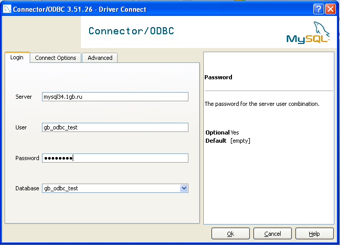 9. Вам будет предложено ввести пароль к БД. Введите пароль и нажмите "Ok". Не смущайтесь, что вас спрашивают пароль несмотря на то, что вы его уже, может быть, вводили - это нормально. Дополнительные параметры в этом окне лучше не изменять.