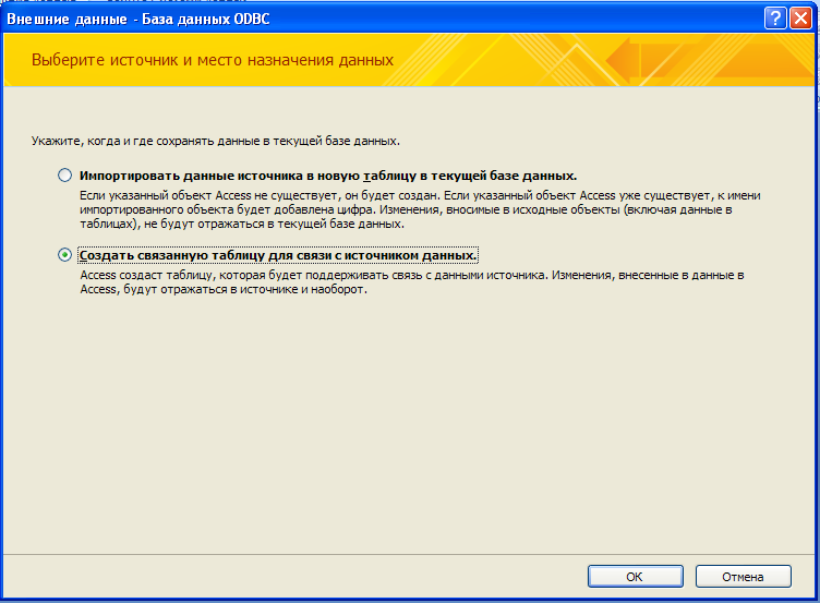 3. Выберите вариант, в котором вы будете работать. Первый пункт позволит сделать копию баз данных mySQL в проекте Access, второй пункт (выбран на картинке) позволит вам вносить изменения в БД mySQL из Access.