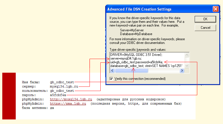 6. Вам нужно вставить строку соединения с дополнительными параметрами. Параметры базы данных (логин, пароль и т.п.) возьмите со страницы "пароли на ресурсы" личного кабинета, пример строки соединения возьмите из базы знаний хостинга - mySQL из .NET/ASP (ODBC клиент). Для корректной работы с русским языком бязательно добавьте параметр определяющий язык строковых переменных, например stmt=SET NAMES 'cp1251'. Получившееся сочитание данных может представлять собой как одну строку (длинную) так и несколько строк разделённых символом ; (как на картинке). После формирования строки соединения нажмите Ok и Next ("Дальше"). В ходе работы мастера вас могут несколько раз спрашивать пароль к БД в диалоге драйвера mySQL - вводите пароль и нажимайте "Ok", дополнительные параметры не указывайте.