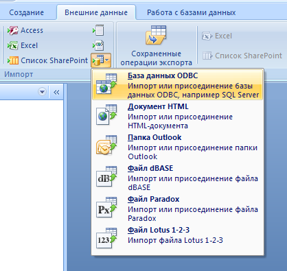 2. В группе "Импорт" раздела ленты "Внешние данные" программы Access 2007 выберите пункт "Дополнительно" и "База данных ODBC".